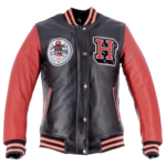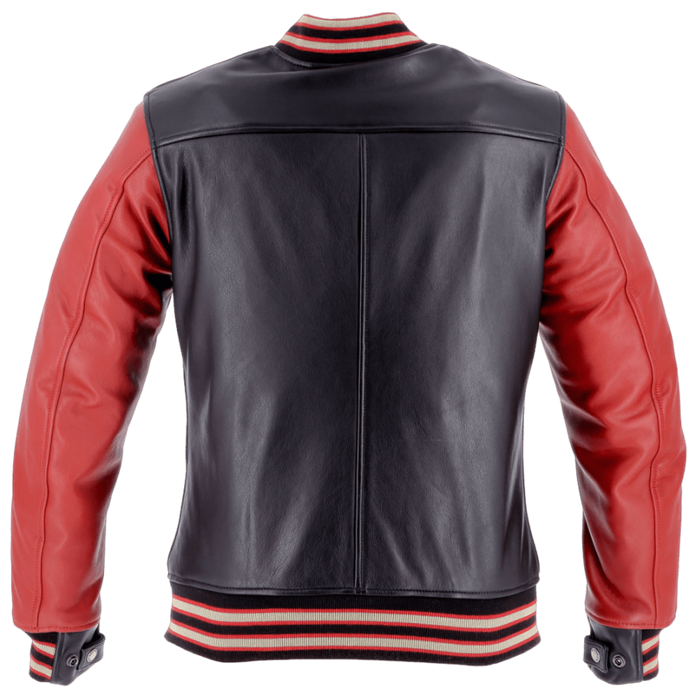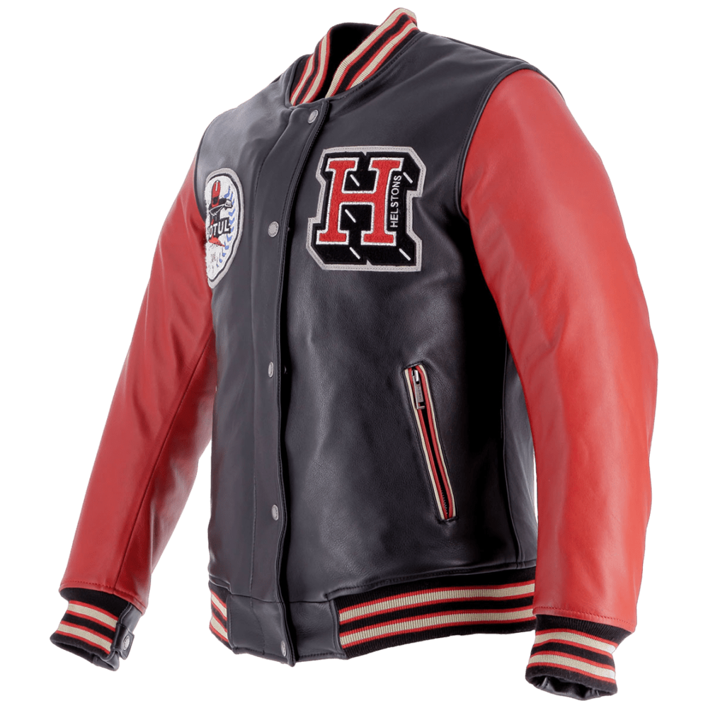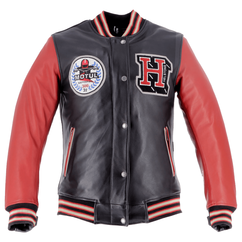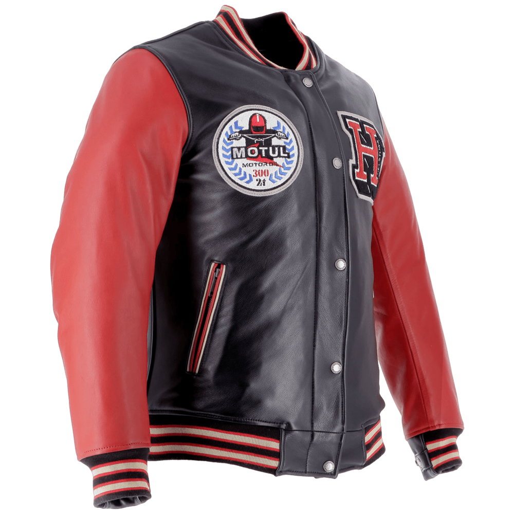 Die ikonische amerikanische Collegejacke, durchdrungen von der Expertise des Helstons-Designers und verziert mit dem Motul Heritage 300 2T Öl-Logo, wurde in eine schützende Motorradausrüstung verwandelt.