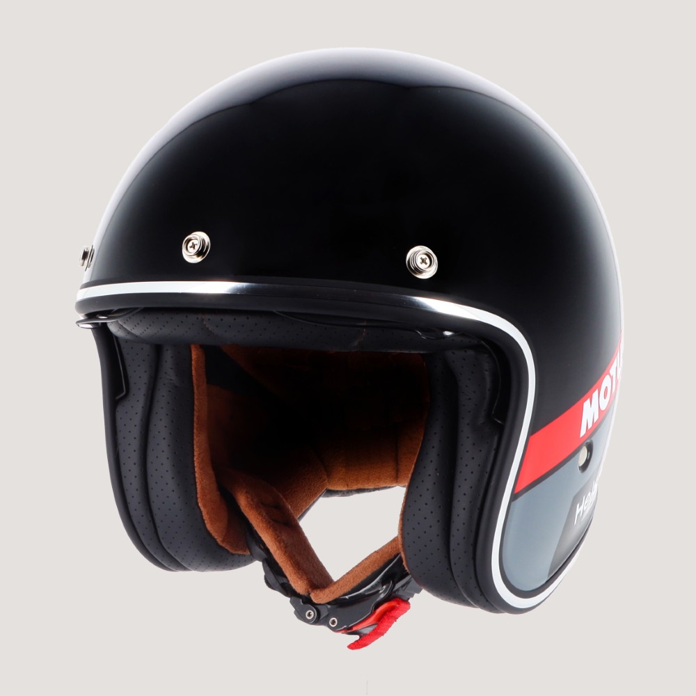 Der Helm zeigt stolz das ikonische Motul-Logo auf einem dekorativen Streifen sowie die Helstons-Signatur, wodurch Motorradhistorie mit modernem Design verschmilzt.