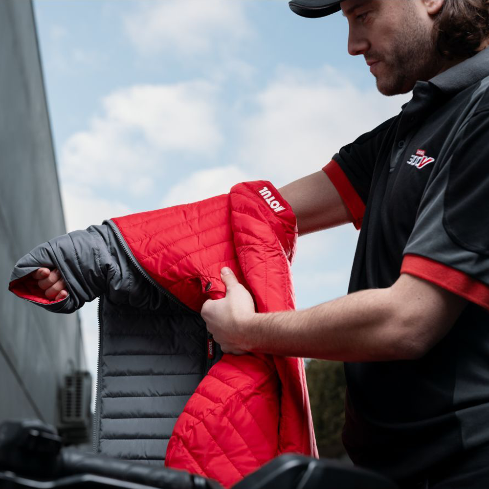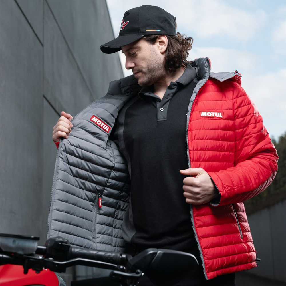 Tragen Sie ihn in Rot oder in Grau – die neue gesteppten Jacke ist jetzt wendbar, ohne dabei auf ihre gewohnten Qualitäten zu verzichten. Sie ist bequem, leicht und dezent mit einem Motul-Silikonlogo auf der linken Brust und dem rechten Ärmel versehen.